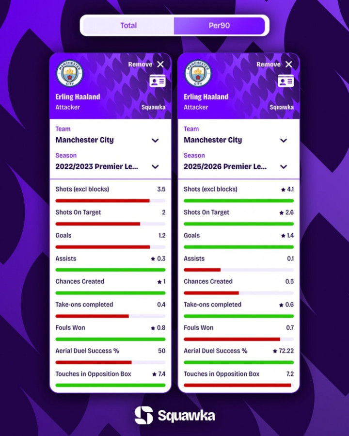 Ngày 18 tháng 11, Squawka đã thống kê số liệu của Haaland ở mùa giải 22-23 (36 bàn ở Premier League) và mùa giải này rồi đưa ra so sánh.