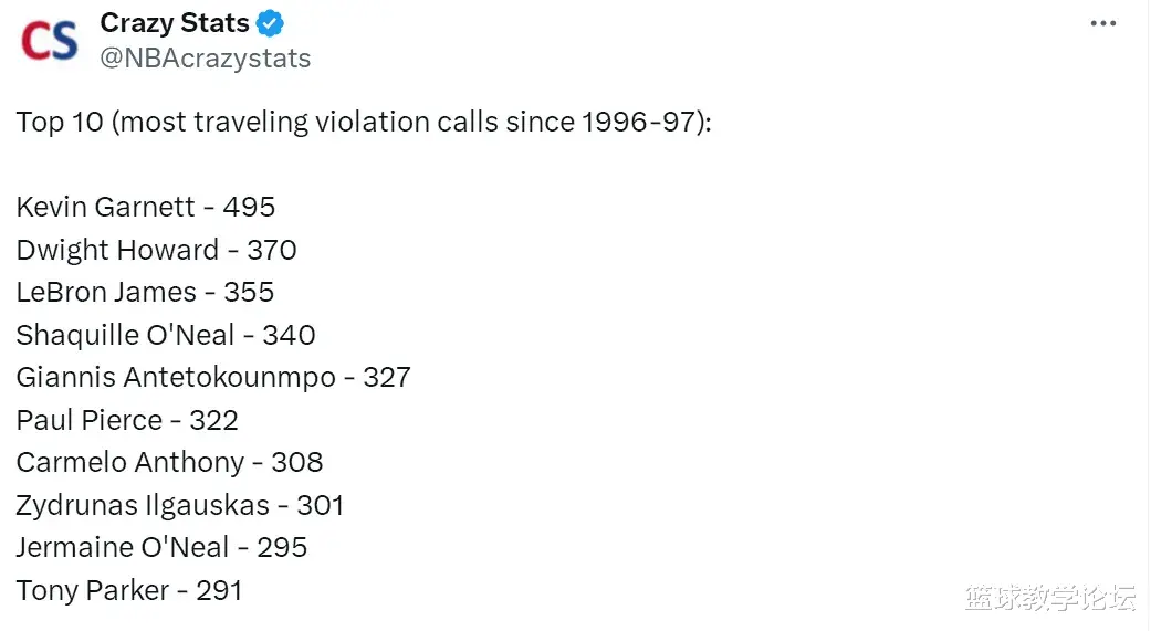Như chúng ta đều biết, có tất cả các loại thống kê trong NBA. Nhưng một số dữ liệu rất chi tiết được tính từ mùa giải 1996-97, chẳng hạn như số bước. Các số liệu thống kê Crazy Media NBA đã bao gồm 10 người chơi với nhiều bước nhất trong NBA kể từ khi thống kê được thực hiện. Danh sách này chỉ tính các vi phạm của trọng tài trong hành động và không bao gồm các bản án bị bỏ lỡ.
