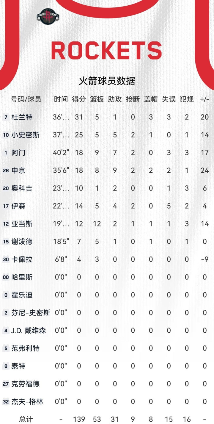 Trong chiến thắng này, tổng cộng có bảy cầu thủ đã ghi bàn với con số gấp đôi. Durant chắc chắn là cốt lõi trong chiến thắng của đội. Anh ấy có một pha chạm bóng nóng bỏng và ghi được 31 điểm hiệu quả ở 11/19 cú sút. Anh cũng đóng góp 5 rebound và 1 kiến tạo. Anh ấy cũng thực hiện 3 pha cản phá ở hàng phòng ngự và gánh đội bằng màn trình diễn tấn công và phòng thủ của mình. Smith Jr. cũng thể hiện hoàn hảo, thực hiện 8 trong số 16 cú sút và 4 trong số 9 cú sút từ ngoài vạch ba điểm. Trong khi ghi được 25 điểm, anh ấy cũng đảm nhiệm các pha phản công và kiến tạo. Khi phạm lỗi, anh ấy đã giao dữ liệu toàn diện về 5 rebound và 5 kiến tạo; Amen đã có những đóng góp xuất sắc về mặt tổ chức, không chỉ ghi được 18 điểm và 9 rebound mà còn thực hiện 7 pha kiến tạo và 2 lần đánh cắp, kết nối hoàn hảo hàng công của đội; Shen Jing gần như đạt được triple-double với 18 điểm, 8 rebound và 9 kiến tạo, điều này cho thấy khả năng hỗ trợ và ghi bàn kép của anh trong sơn.
