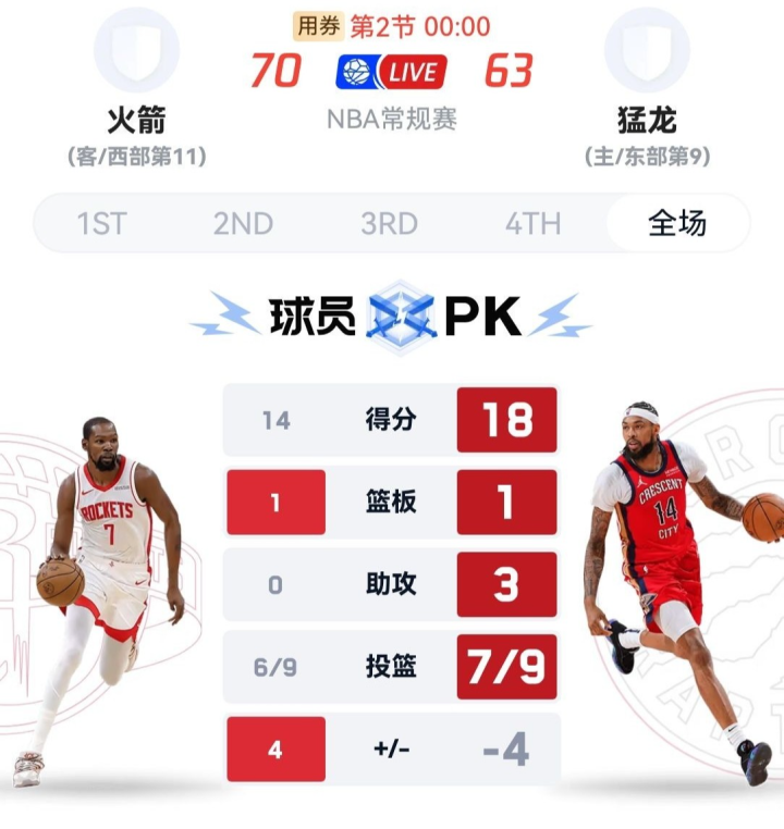Sau đó, hai bên bắt đầu thế trận giằng co cường độ cao và tỷ số luân phiên thay đổi nhiều lần. Ingram ghi bàn liên tiếp giúp Raptors duy trì lợi thế trong thời gian ngắn, trong khi Amen Thompson của Rockets tiến lên và đột phá đầu tiên để ghi bàn 2+1, sau đó ghi bàn trong pha phản công giúp đội giành lại thế dẫn trước. Vào cuối hiệp đấu, Raptors bất ngờ rơi vào tình thế tấn công sa sút, Rockets chớp lấy cơ hội để mở rộng lợi thế. Durant ném trúng hai quả ba điểm, Shen Jing cũng ghi điểm đều đặn nhờ những quả ném phạt. Cuối cùng, hiệp một kết thúc với tỷ số 70-63, tạo nền tảng cho hiệp hai dẫn trước.