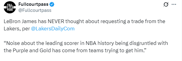 Hôm nay, hãng truyền thông Lakers Daily đưa tin rằng các nguồn tin tiết lộ rằng James chưa bao giờ cân nhắc việc đăng ký giao dịch để rời Lakers. Tin đồn về việc James không hài lòng với Quân đoàn Tím Vàng thực chất là do một số đội cố tình tung tin đồn với mong muốn có được James. Những tin đồn này là không đúng sự thật.