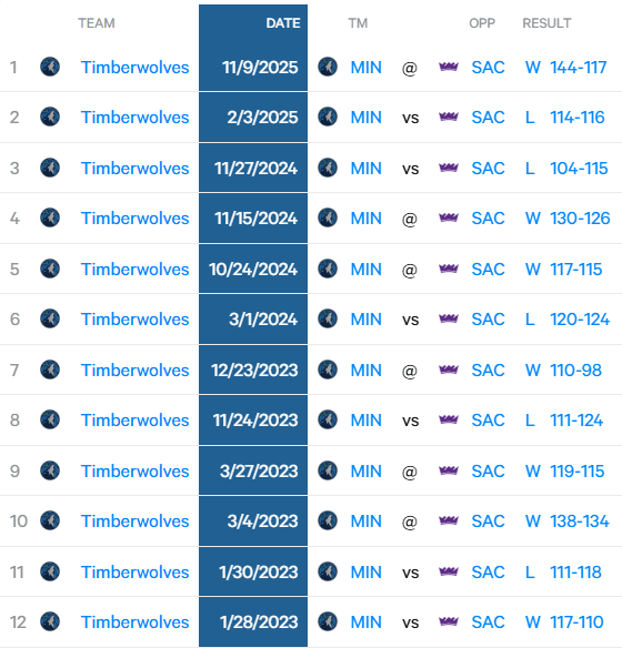 Phương tiện truyền thông Hoa Kỳ Tự động chia sẻ dữ liệu: Kể từ năm 2023, đội khách đã thắng tất cả các trận đấu giữa Timberwolves và Kings. Đội khách đã thắng 11 trận liên tiếp, đây là kỷ lục thắng sân khách dài nhất giữa hai đội trong lịch sử NBA.